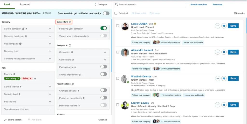Beyond these core filters, Sales Navigator also introduces buyer intent and recent activity filters, which are particularly useful for outreach.