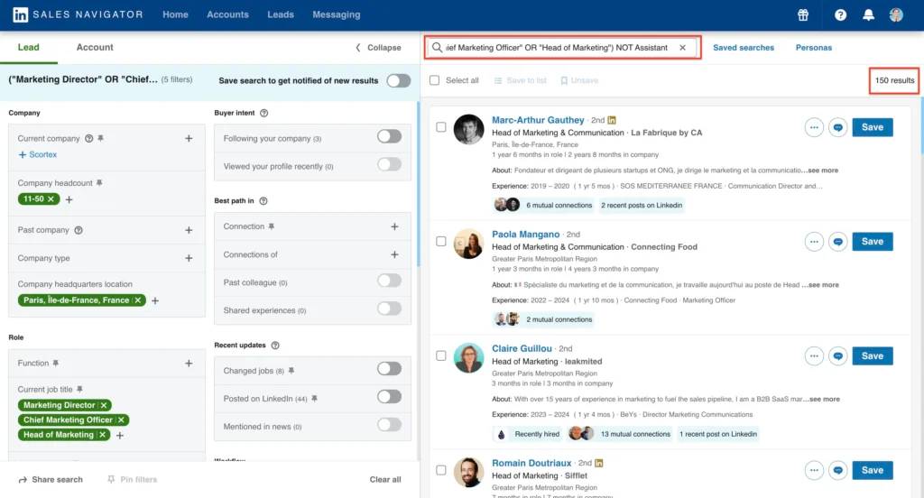 Now that you understand the logic behind Boolean operators, it’s time to put them to use directly in your Sales Navigator lead search. Boolean search allows you to go beyond rigid filters and get very specific about the people you’re looking for.