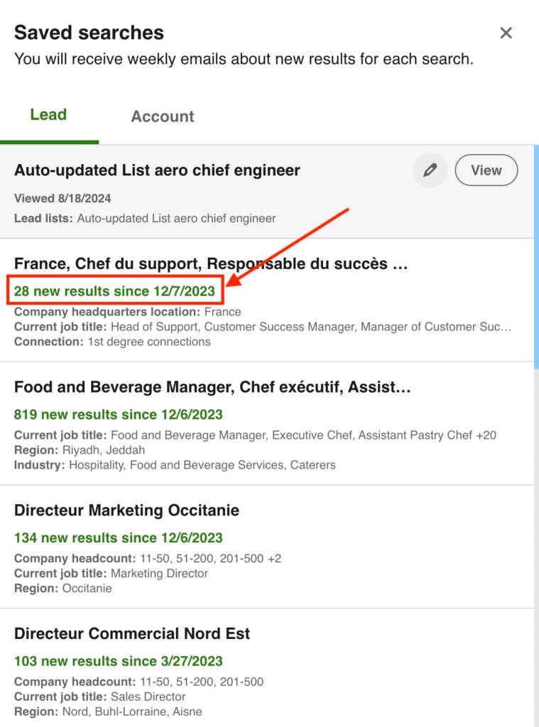 But there’s a small twist. If you go to your saved search and click on the search themselves, LinkedIn will show you all the results for that given search, not just the new one. Make sure to click on the designated number to only access the new leads