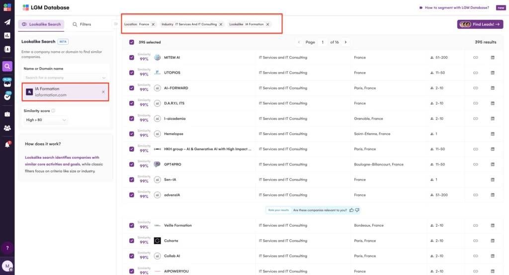 This allows you to uncover prospects that align closely with your existing customer base. You can further refine the results using filters like industry, size, or location to enhance your segmentation.