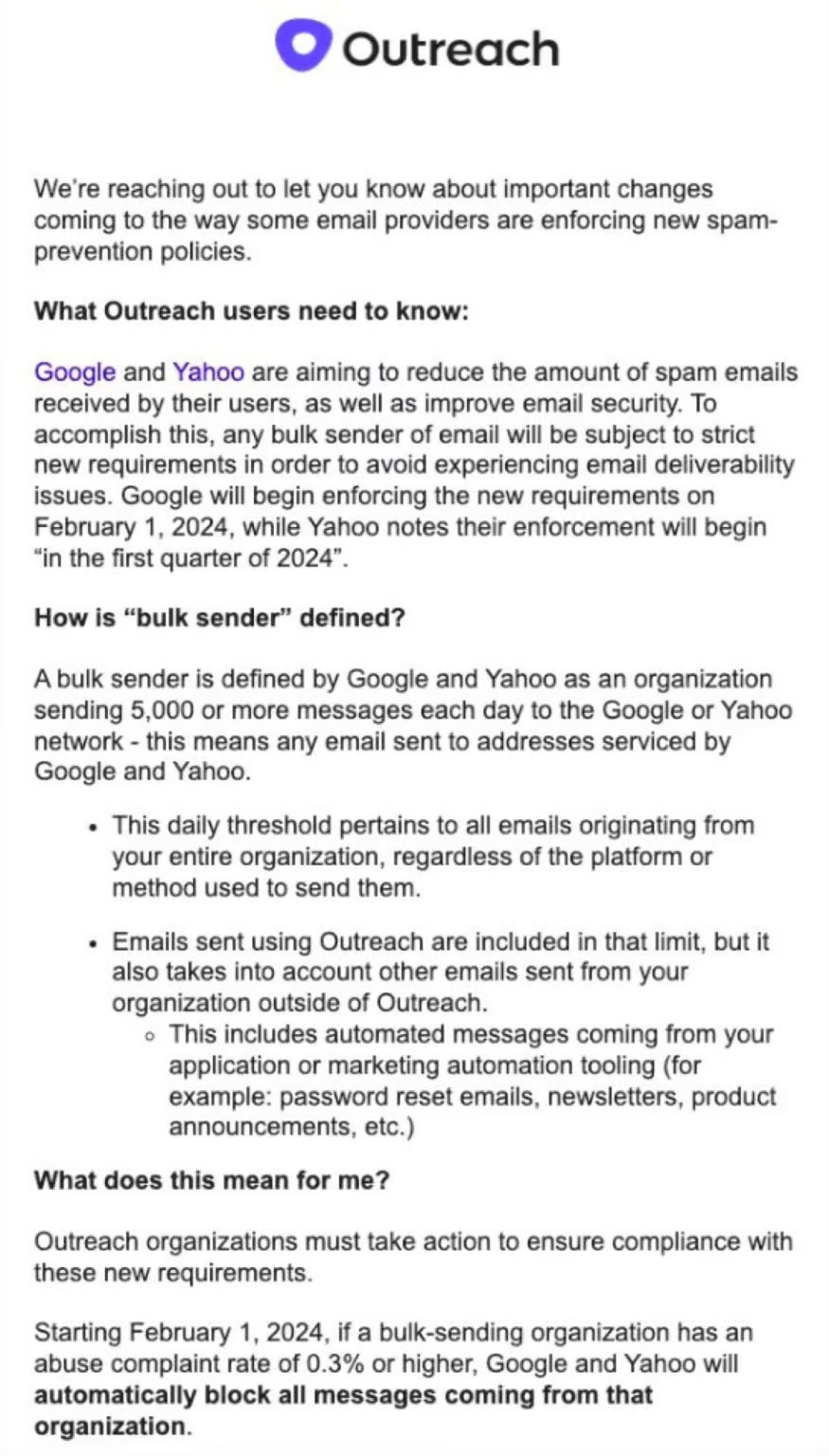 - One of the biggest tools in the market Outreach.io sent a letter to its users informing them of major updates to Gmail and Yahoo mail’s spam rules.