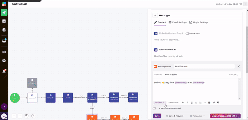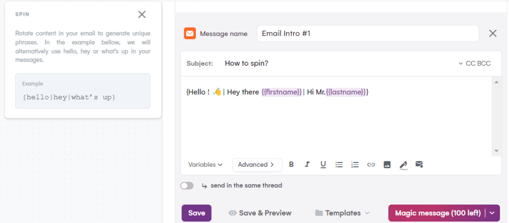 You can play with this throughout your message, you don’t have to use SPIN for greetings only, you can use it in your closers as well: {Let me know what you think| You know where to find me! | Feel free!| I’m available to talk about it} etc.