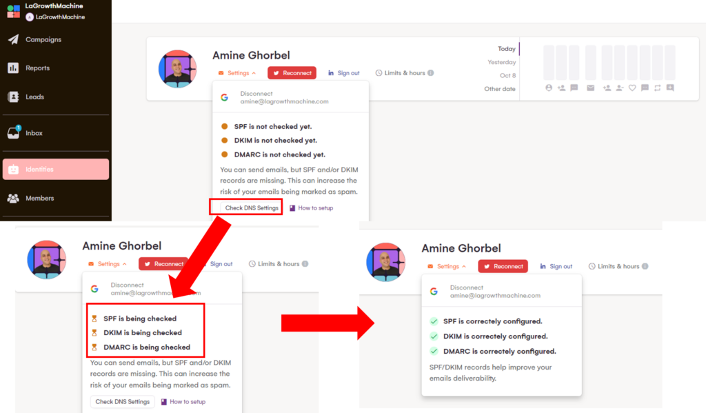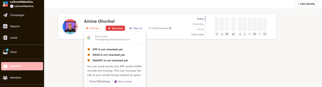 On the identities tab, once you connect your email to LGM, you can see the DKIM, SPF, and DMARC that haven’t been checked yet, but you can do so with just a click. and we’ll take care of all the configuration for you.