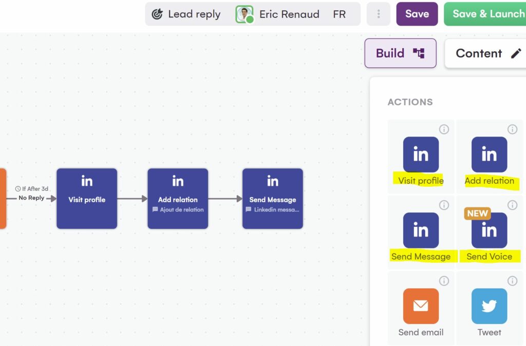 Dazu müssen Sie nur einige Aktionen per Drag & Drop über die verschiedenen von uns vorgeschlagenen Kanäle wie Twitter, LinkedIn oder E-Mail ziehen.
