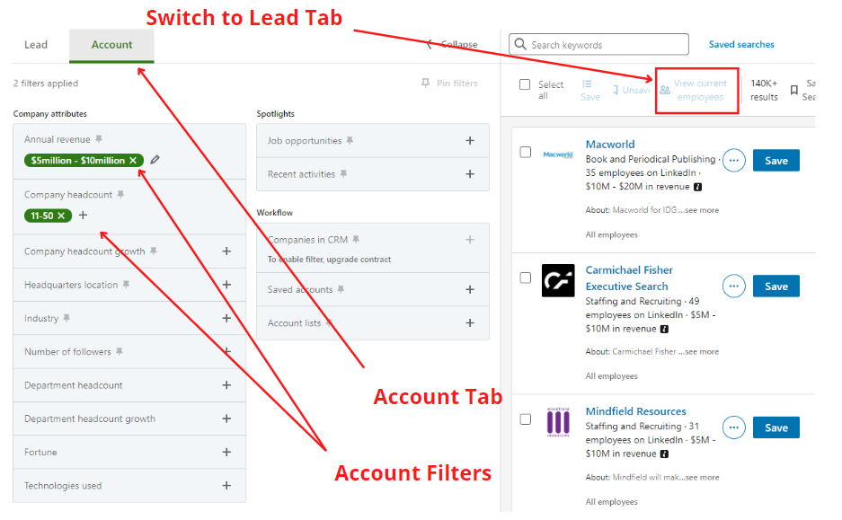 - Die weltweit größte Lead-Datenbank mit sehr hoher Genauigkeit clustern: Mit LinkedIn Sales Navigator können Sie Strategien wie LinkedIn ABM durchführen, die Ihnen helfen, die richtigen Personen anzusprechen.