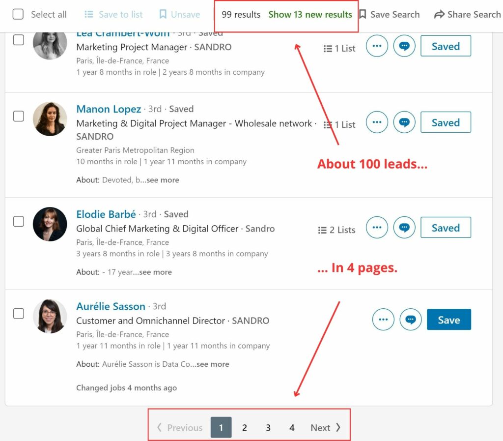- Die Anzahl der Ergebnisse sollte 25 Leads pro Seite nicht überschreiten. Wenn Sie also Ihre Leads exportieren möchten, um sie anzusprechen, dauert es eine eine Weile.