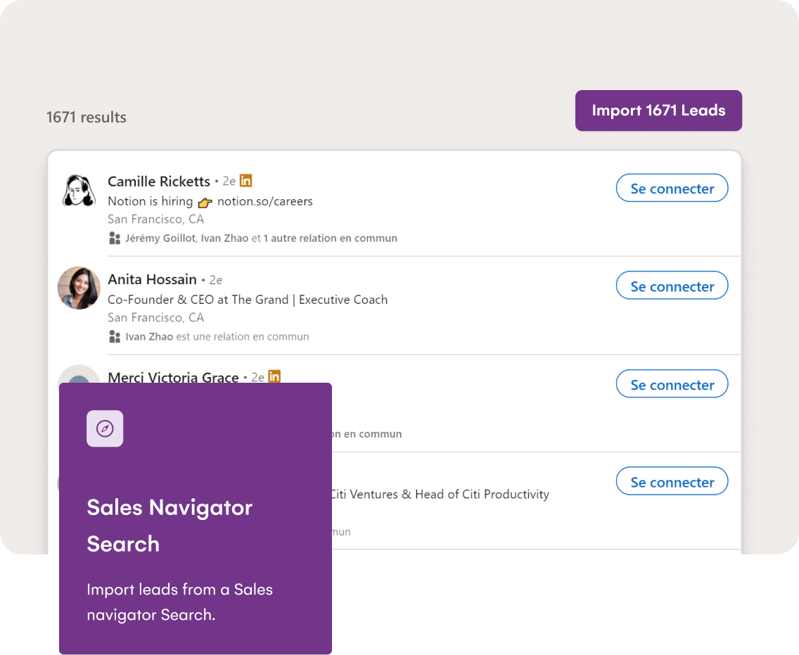 Mit unserer Lösung können Sie Ihre Kontaktlisten von Hand organisieren, bevor Sie sie im Autopilot-Modus kontaktieren. Keine Sorge, alle ihre Verhaltensweisen sind denen von menschlichen Nutzern perfekt nachempfunden.