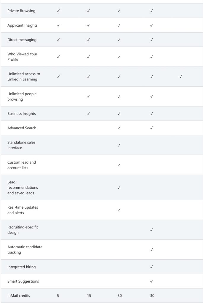 Sie sind sich trotz der obigen Erklärungen immer noch nicht sicher? Keine Panik, LinkedIn hat eine Übersichtstabelle erstellt, damit Sie die Funktionen der einzelnen Pläne verstehen und sie leicht vergleichen können.