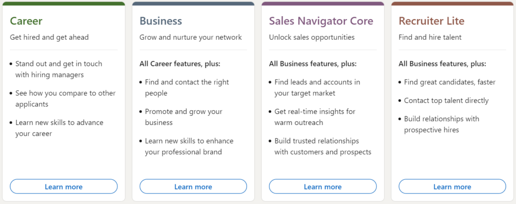 Werfen wir einen genaueren Blick auf die verschiedenen LinkedIn Premium Subscriptions und was sie bieten.
