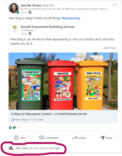 Am Ende jedes Beitrags, den Sie erstellen, können Sie sehen, wie viele Personen ihn tatsächlich gesehen haben. Dies ist ebenfalls eine gute Kennzahl, die Sie verfolgen können, denn je mehr Sie posten, desto mehr Menschen sehen es (normalerweise basierend auf dem Algorithmus und darauf, wie viele Menschen damit interagieren). Ihr Beitrag wird auch Personen in ihrem Netzwerk angezeigt, wenn die Personen mit ihm interagieren (siehe unten).