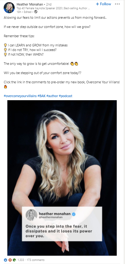 Dieser Beitrag ist insgesamt ziemlich brillant, weil er ihr Gesicht zeigt, inhaltlich sehr inspirierend ist, aber auch für ihr themenbezogenes Buch wirbt, indem sie den Link in einem Kommentar veröffentlicht. Eine relativ perfekte Strategie, denn sie zeigt den Inhalt, den sie finden werden, zieht die Leute an, die sich mit ihm verbunden fühlen werden, und regt mit den mehr als 170 Kommentaren auch einige Gespräche an.