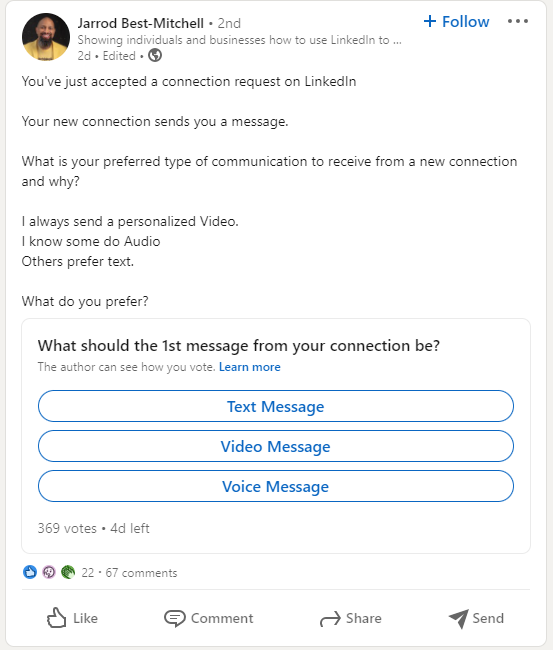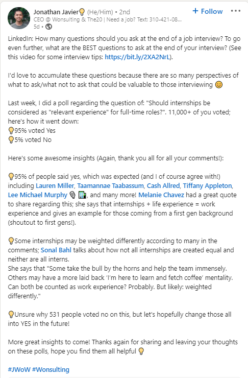Das gilt vor allem, wenn Sie noch dabei sind, Ihr Netzwerk aufzubauen. Denken Sie daran, dass es einige Zeit dauern wird, wenn Sie noch nicht über Hunderte oder Tausende von Verbindungen verfügen, um dieses Niveau zu erreichen. Eine interaktive Posting-Idee besteht darin, auf Ihre eigene Art kreativ zu sein.