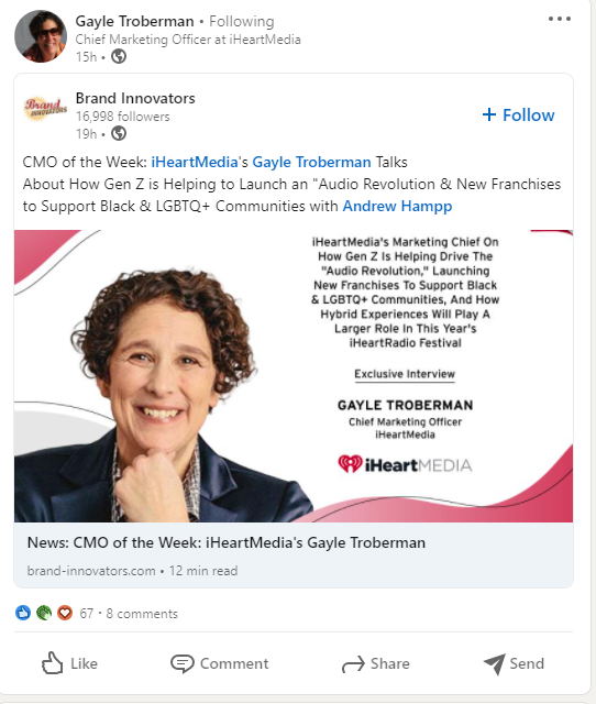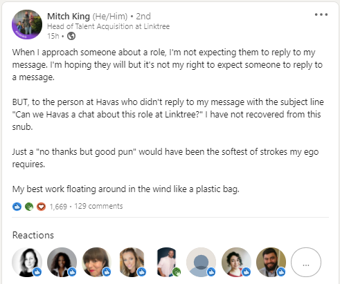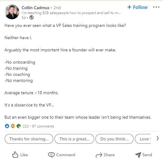 Das Tolle an diesem Beitrag ist, dass die ersten Zeilen Sie neugierig machen. So sehr, dass es 97 Kommentare von Leuten gibt, die entweder zustimmen oder widersprechen, aber eine wichtige Konversation mit ihren Followern in Gang bringen.