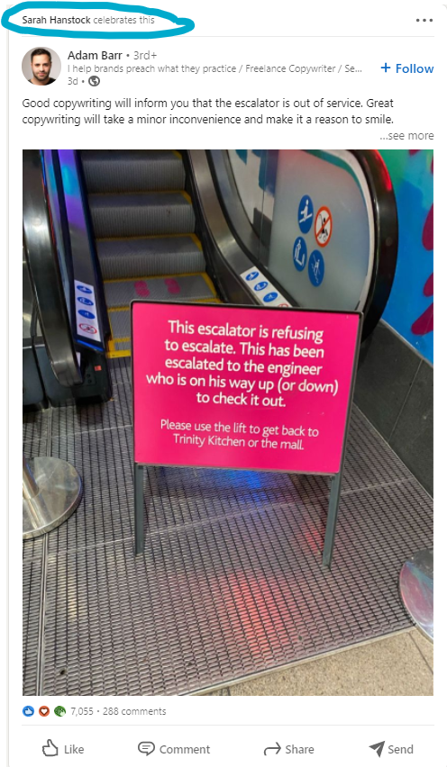 - Teilen Sie die Beiträge anderer Personen, ohne einen Mehrwert zu bieten. Im folgenden Beispiel teilt jemand eine Anerkennung, die er erhalten hat, ohne auch nur ein Dankeschön zu sagen. Das ist leer und unbeholfen, tun Sie das nicht.