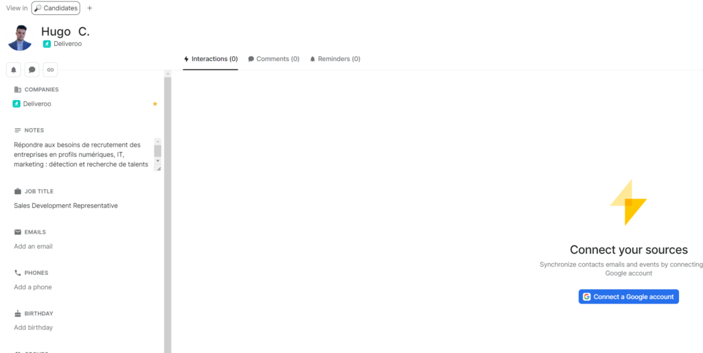 Luego, tenemos Folk: una herramienta CRM personal, que le permite gestionar sus relaciones con los candidatos por un lado, y discutir libremente sus progresos con sus compañeros de equipo por otro.