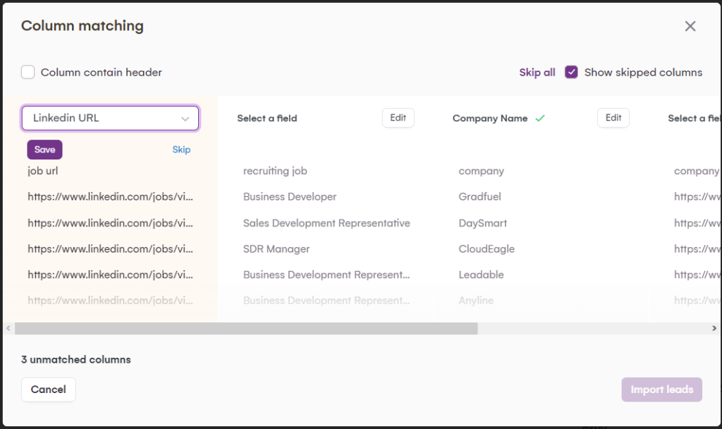 A continuación, se encontrará con una interfaz intuitiva en la que podrá emparejar la información de los leads con sus respectivas columnas.