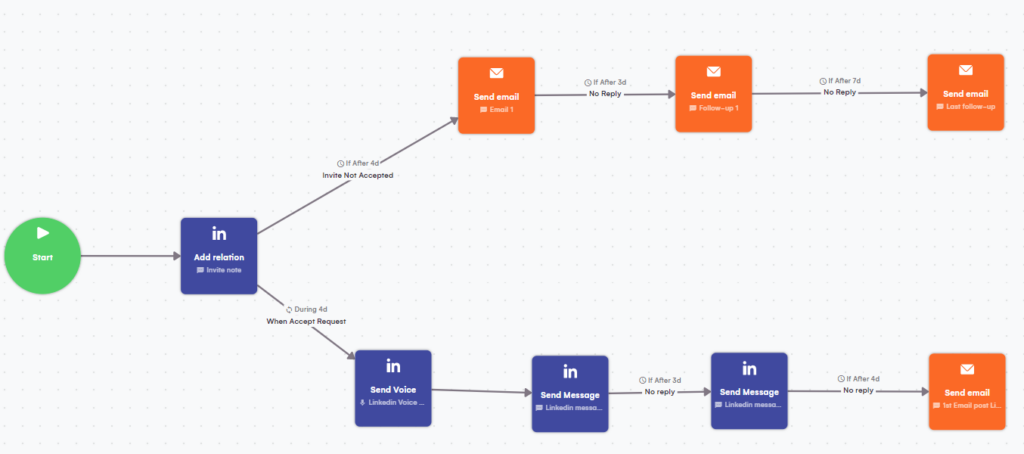 La mayor ventaja de LaGrowthMachine es realmente su enfoque omnicanal. Si el candidato no respondió en LinkedIn, intentará contactar con él por correo electrónico.