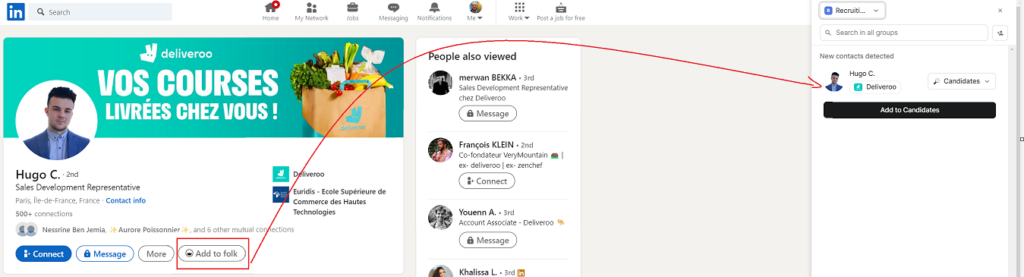 Aquí es donde verá intervenir la barra lateral Folk; sólo tiene que pulsar “Añadir a folk” y seleccionar en qué espacio de trabajo y grupo desea añadir a su candidato.