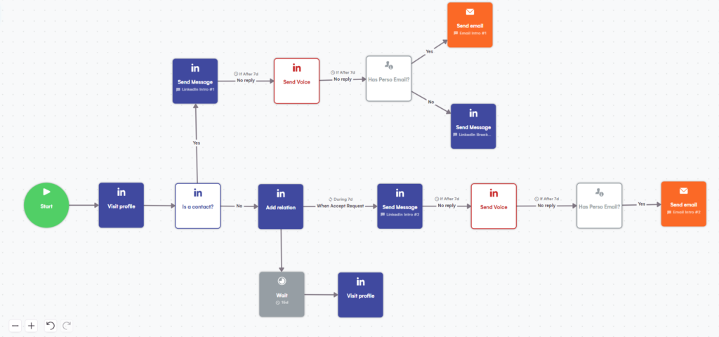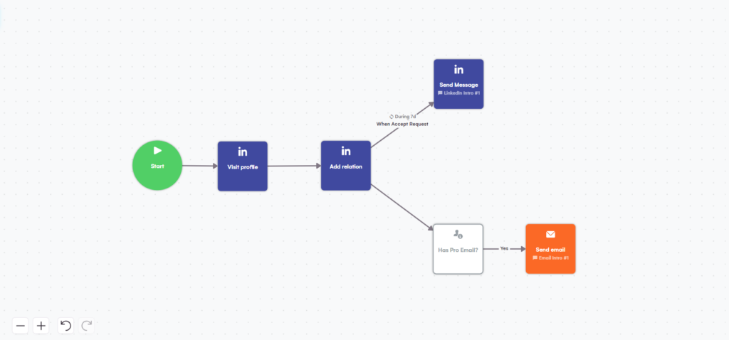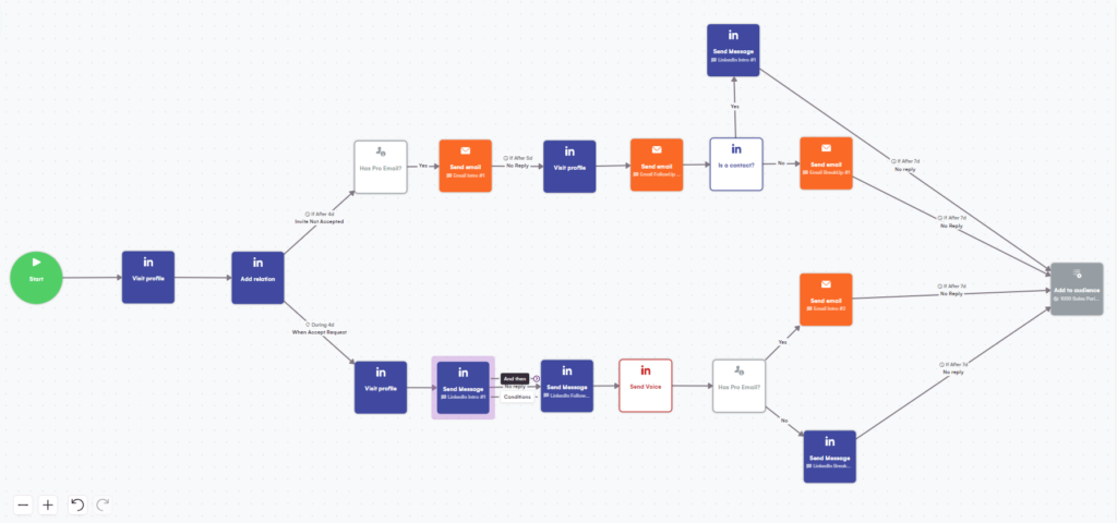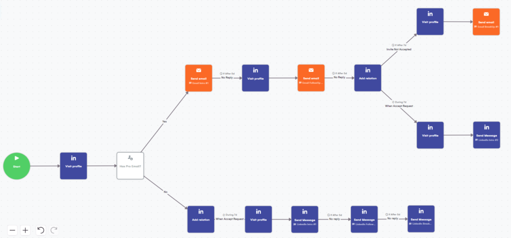 - “Condición “¿Es un contacto? Después de tu seguimiento, comprueba si le han aceptado. En caso afirmativo, continúa la conversación en LinkedIn (ten en cuenta que ya les has enviado 2 correos electrónicos, así que añada nuevo contenido). Si no lo han hecho, entonces utiliza el último recurso, el correo electrónico de “ruptura”.