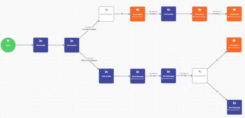 ** Puedes jugar con este número. Si tu objetivo utiliza LinkedIn a menudo, redúzcalo a 3 días, ya que es probable que no te acepten después de ese plazo. Por el contrario, si rara vez utilizan la plataforma, espera hasta 14 días antes de pasarte al correo electrónico.