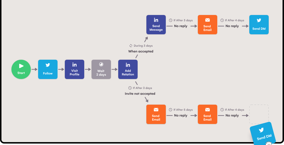 Sin embargo, en LaGrowthMachine -y en otras herramientas de automatización de ventas multicanal- incluimos plataformas como Twitter, por ejemplo, en nuestros flujos de trabajo. Algunas personas también podrían considerar WhatsApp, o incluso una llamada telefónica, que también puede considerarse como otro canal.