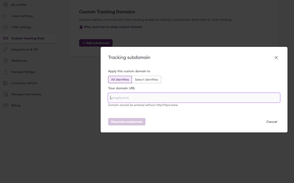 - Configure su dominio de correo electrónico personalizado con su identidad en LaGrowthMachine;
