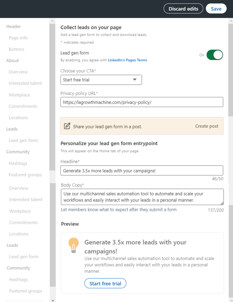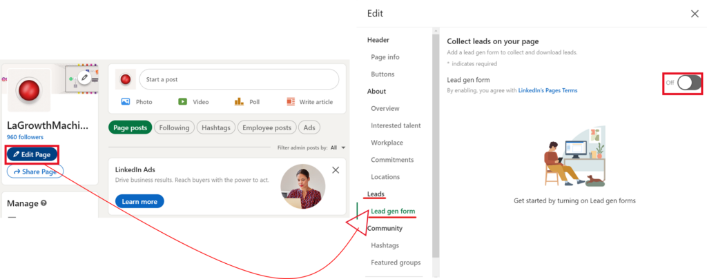 También trabajan mano a mano con LinkedIn Ads, lo que significa que puedes crear una campaña dentro de LinkedIn Ads y dirigir a los usuarios a tu formulario de Lead Gen una vez que hagan clic. Sin embargo, en este artículo, me centraré principalmente en la configuración de la página de empresa de LinkedIn.