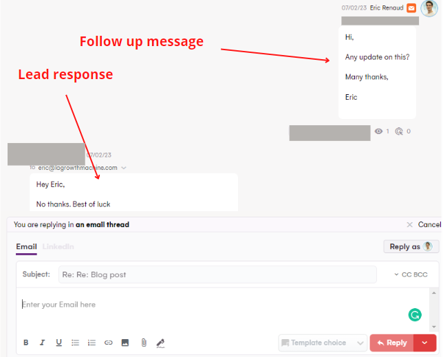 Gracias a LaGrowthMachine, puedes configurar todos tus mensajes de seguimiento con antelación, lo que supone un enorme ahorro de tiempo y un aumento drástico de la conversión.