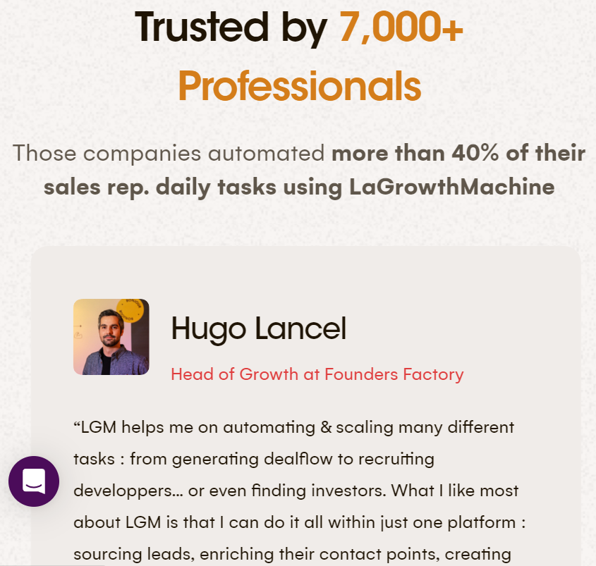 ¿Buscas mejorar la eficiencia de tu departamento de ventas? LaGrowthMachine te permite generar una media de 3,5 veces más leads, ahorrando una cantidad increíble de tiempo en todos tus procesos. ¡Al registrarte hoy, obtienes un período de prueba de 14 días sin coste para probar nuestra herramienta!