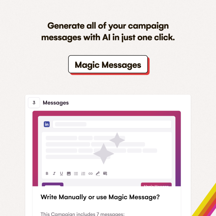 En LaGrowthMachine, hemos empezado a desarrollar algunas funciones básicas relacionadas con esta tendencia. Es el caso de nuestra nueva función Mensaje Mágico. Sólo tienes que hacer clic en un botón y nuestra herramienta identificará y generará el mensaje de ventas adecuado gracias a la IA