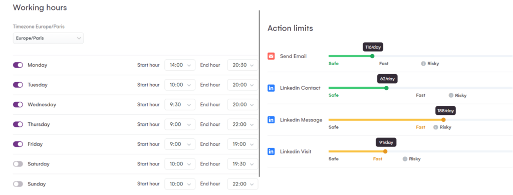 Una de las características imprescindibles de toda herramienta de automatización del alcance como La Growth Machine es la capacidad de controlar y gestionar cuántos mensajes se envían y cuándo se envían.