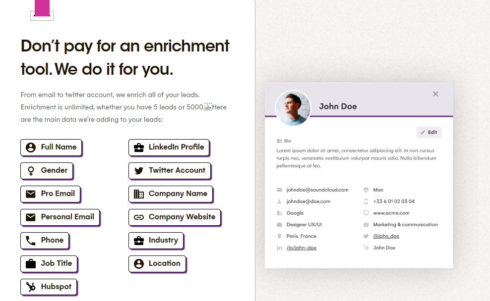 Deje de lado conjeturas o prejuicios. En LaGrowthMachine contamos con la exclusiva función “Enrich”. Con ella, obtendrá información personal de sus leads con márgenes de errores casi nulos: