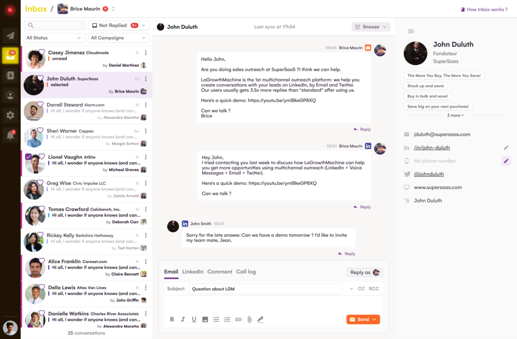 También puede actualizar su CRM con interacciones automatizadas por LaGrowthMachine. Sea el último mensaje enviado en Linkedin, el tweet que le ha gustado a un lead o un correo que han respondido, todo esto se registran automáticamente en el CRM. ¡No pierda más tiempo!