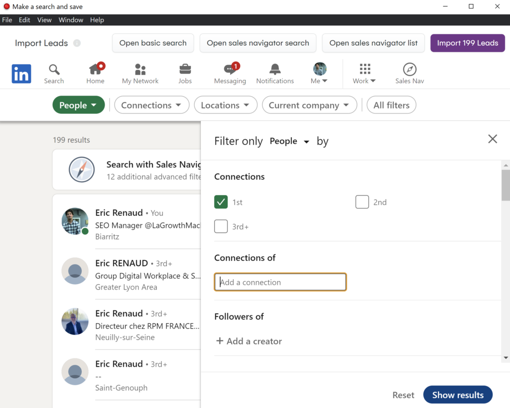 También puede utilizar los filtros avanzados para encontrar conexiones de segundo y tercer grado. Esto puede resultar útil si está tratando de llegar a nuevas personas con fines de venta o de creación de redes.