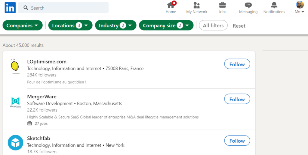 - LinkedIn le mostrará una lista de resultados que coinciden con sus criterios.