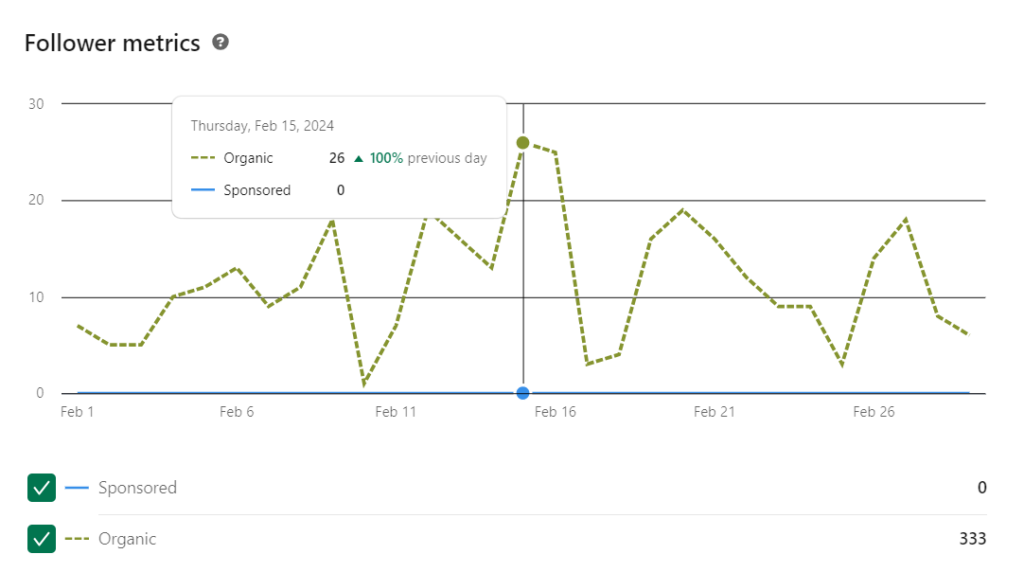 LinkedIn incluso te ofrece un recuento diario detallado de tus seguidores. También puedes distinguir si son seguidores orgánicos o patrocinados (a través de LinkedIn Ads).