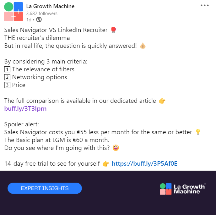 - Intermedio: Añade una etiqueta UTM a tus enlaces. Siempre que publiques un post como el de mi ejemplo anterior, piensa en añadir una etiqueta UTM a tu enlace CTA. Por ejemplo, en el post anterior que compartí, quería enviar a la gente a mi artículo en el que comparaba Sales Navigator frente a LinkedIn Recruiter (¡échale un vistazo!).