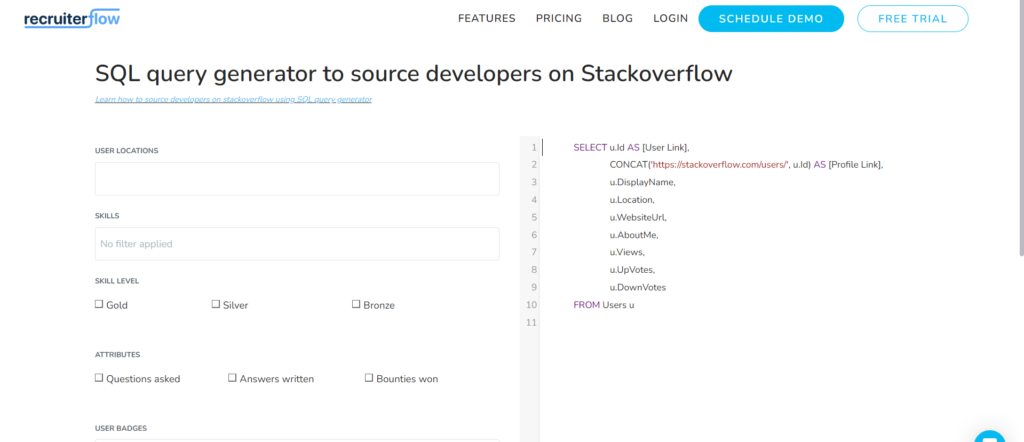 No he podido encontrar ninguna aplicación que te ayude a buscar perfiles específicos como OctoHunt, sin embargo, tengo la siguiente mejor opción: un generador de consultas SQL.