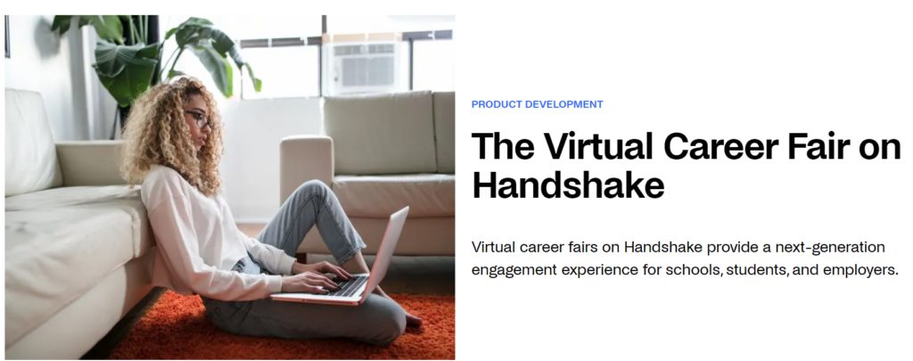 - Handshake: Es el portal de empleo por excelencia para estudiantes universitarios, ya que tienen muchas alianzas con universidades de todo el mundo. Puede inscribirte en ferias de empleo en línea y conocer/reclutar a gente de todo el mundo Una plataforma similar sería HigherEd.