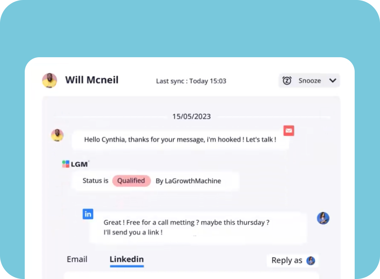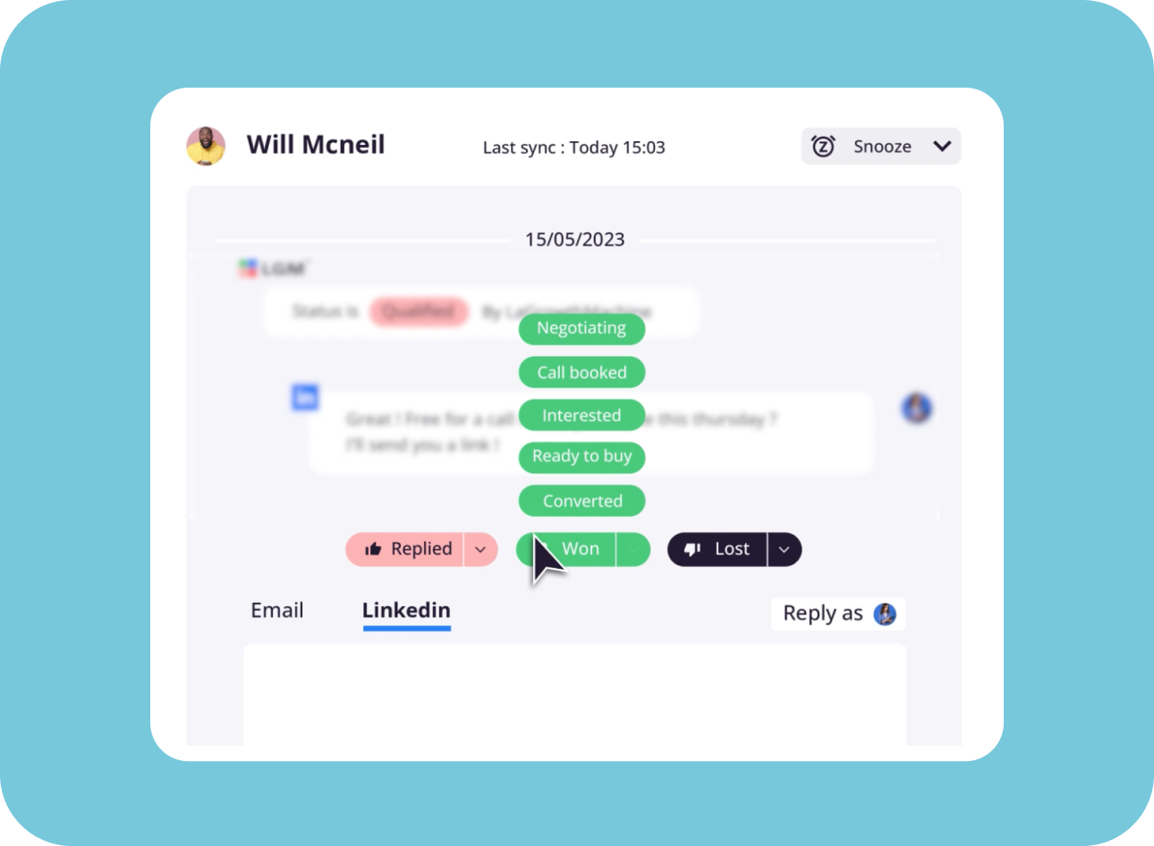 Tired of having to switch between your LinkedIn and email inboxes ? With our multichannel inbox, all your conversations are grouped by leads, in a single interface.