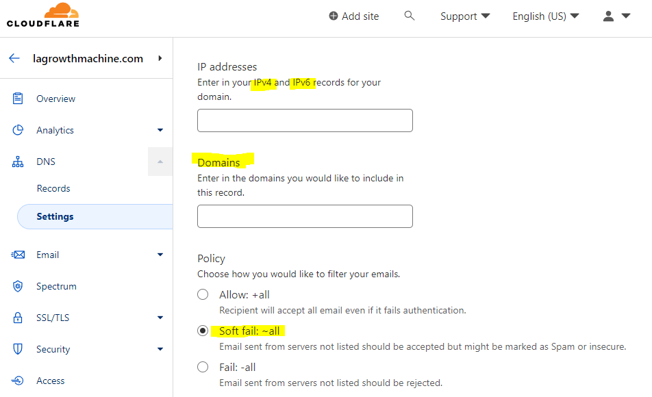 - ~tous : Il est également permis à un serveur alternatif d’envoyer des e-mails au nom du domaine. Par exemple, il peut s’agir d’un fournisseur de services de marketing par courriel tiers. Pour toutes les autres sources de courrier non listées, marquez-les comme un échec mou dans le SPF et laissez leurs e-mails passer.
