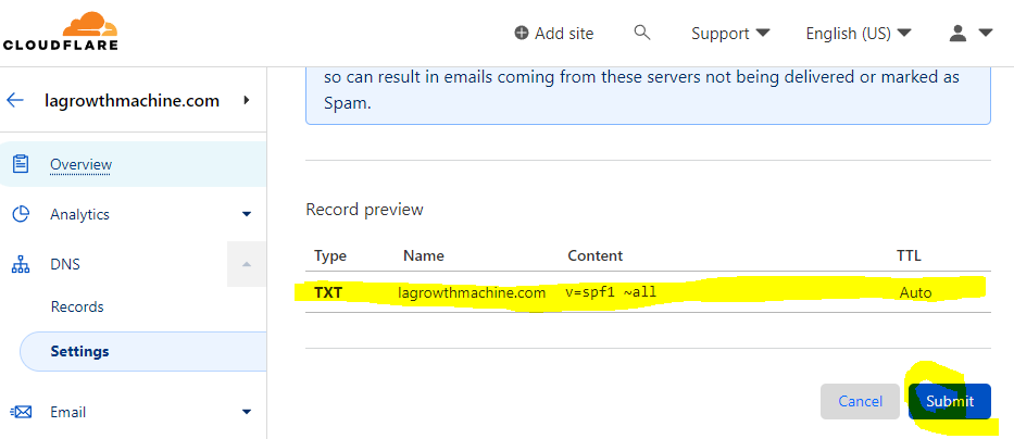 Une fois que vous avez créé la nouvelle entrée TXT, il vous suffit de soumettre votre code dans votre console DNS. Dans cet exemple, v=spf1 a ip4:12.34.56.78/28 include:lagrowthmachine.com ~all.