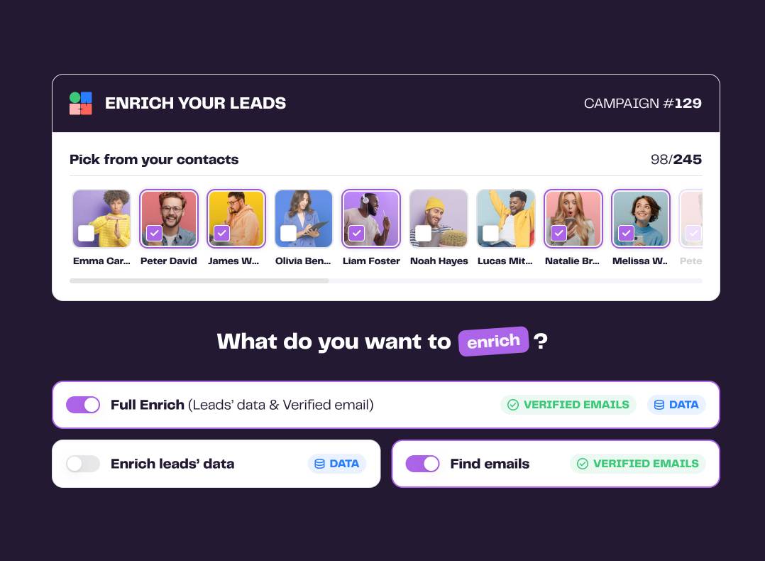 Enrichissez vos prospects avec des emails vérifiés et les données de profil pertinentes en un seul clic.
