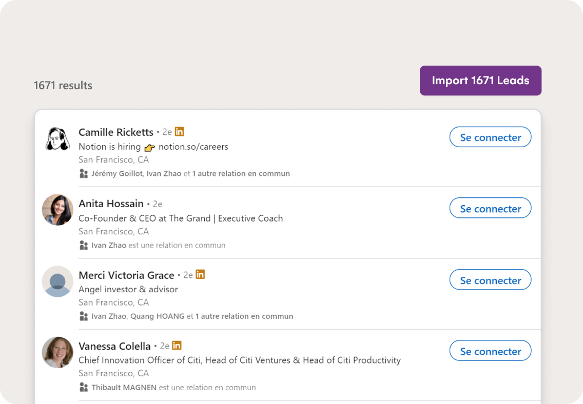 L’outreach est la spécialité de LaGrowthMachine, même si nous l’avons un peu revisité à notre façon. Plutôt que de faire le travail en manuelle, on vous propose d’importer des milliers de prospects froids correspondant exactement à votre cible, puis d’aller les démarcher un à un de manière ultra-personnalisée et naturelle.