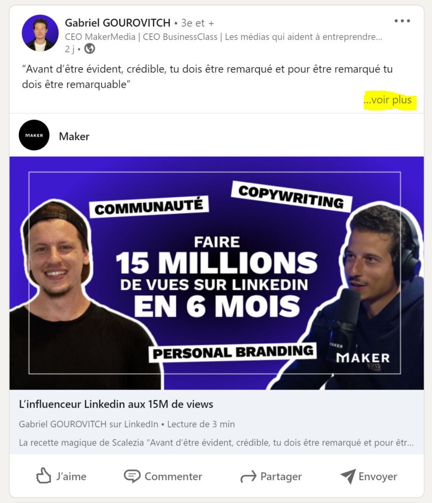 Pour un post classique (texte + image), LinkedIn affichera 500 caractères au maximum. Si vous insérez un lien intra-publication, une image ou une vidéo, alors seuls les 100 premiers caractères seront affichés, suivis du tag « Lire la suite ».