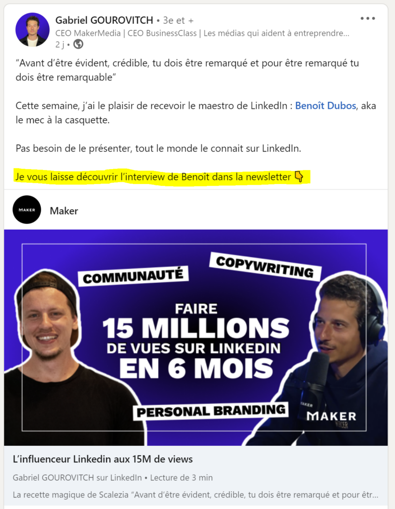 Pour optimiser votre engagement, à l’inverse des LinkedIn cold messages, il est donc recommandé de faire des posts à rallonge, en sautant des lignes, pour teaser au maximum l’utilisateur.