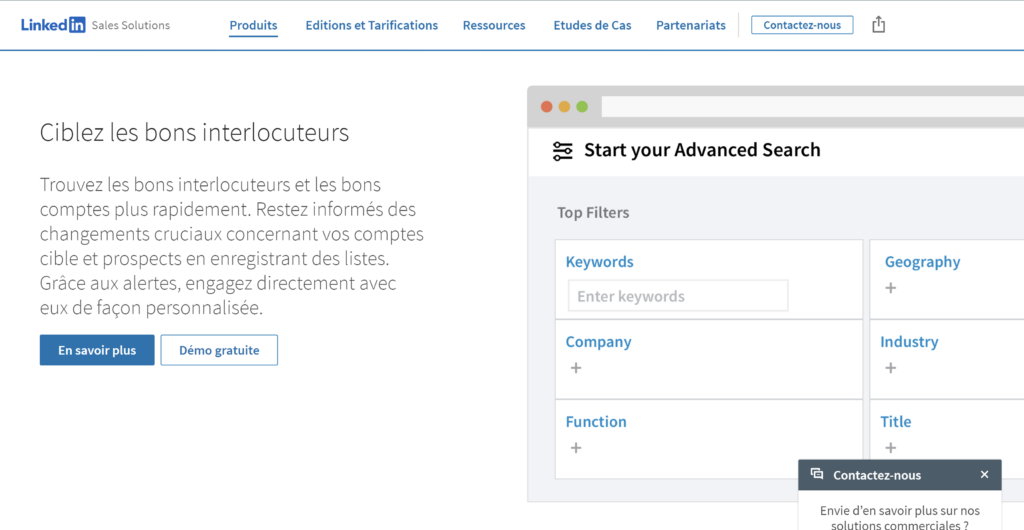La fonction « Recherche avancée« pour cibler les utilisateurs en fonction de différents critères (localisation, taille de l’entreprise, niveau d’expérience, etc.) ;