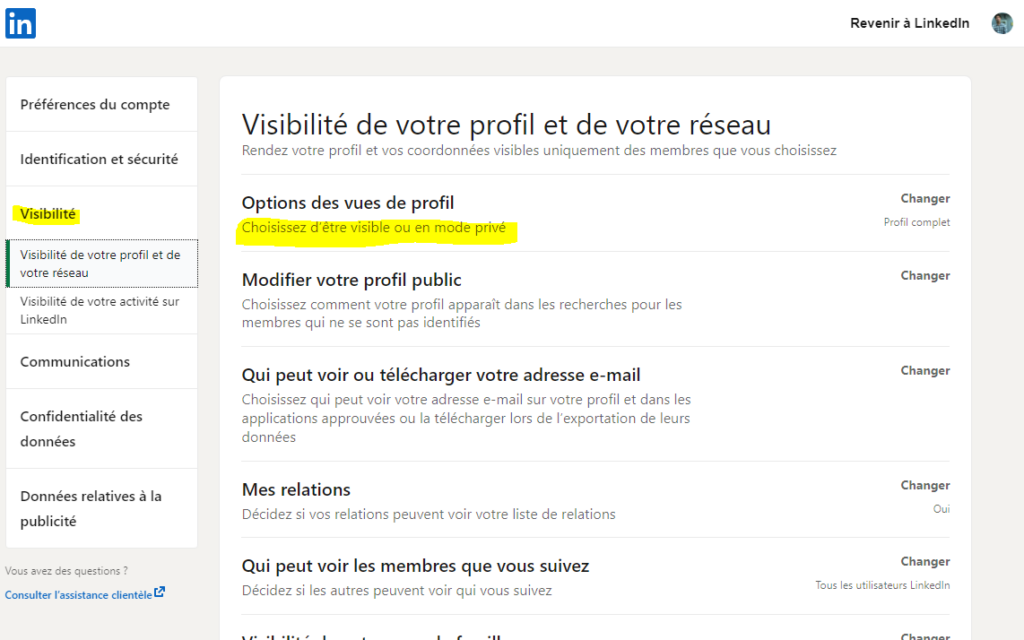 Au niveau du profil LinkedIn, rendez-vous dans la section « paramètres de confidentialité » dans le menu et sélectionnez l’option « Activer le mode privé ».
