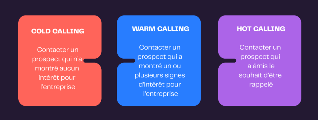 • Le warm calling : contacter un prospect qui a montré un ou plusieurs signes d’intérêt pour l’entreprise (ouvertute d’emails, inscription à un webinaire…).