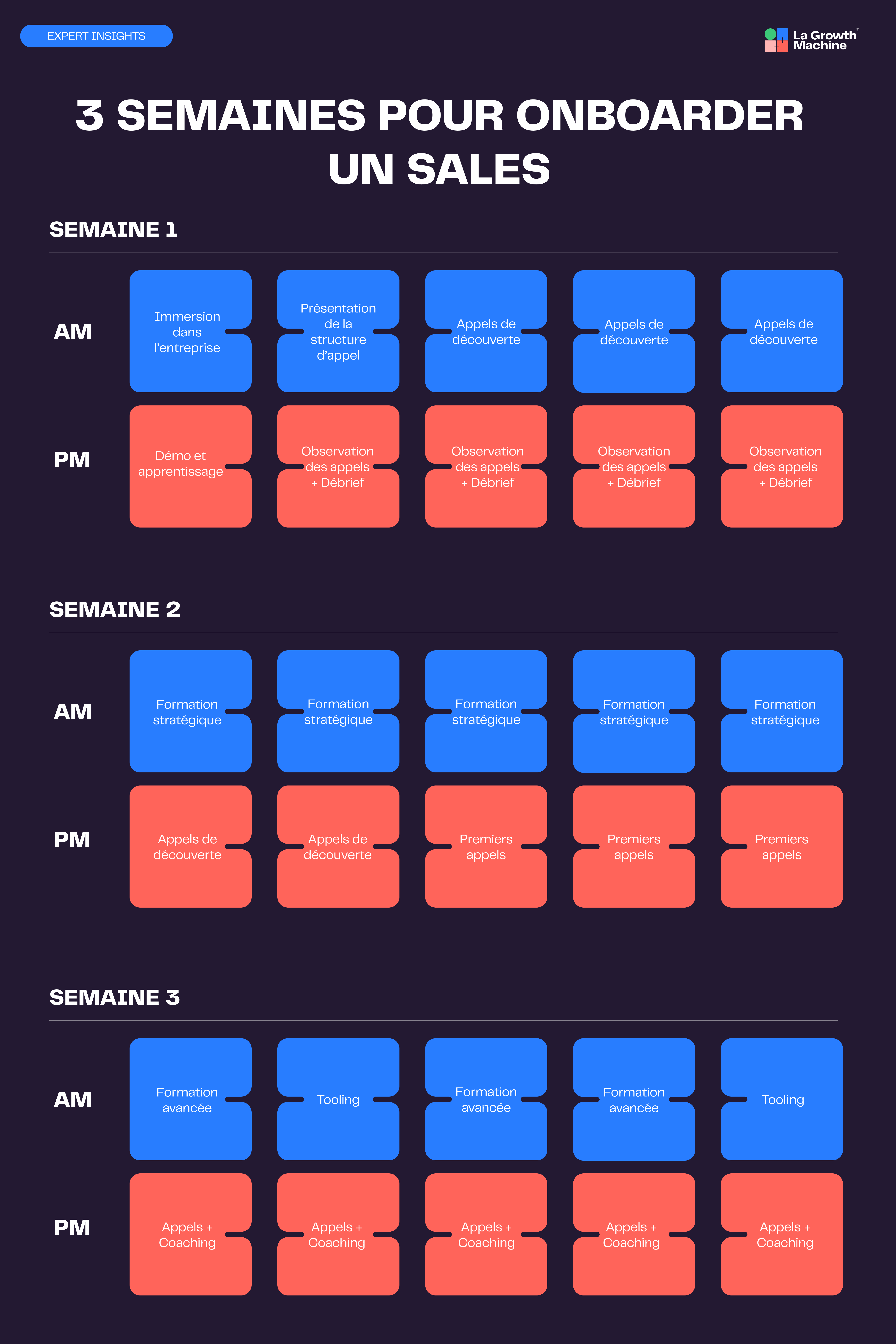 Il s’agit d’une analyse semaine par semaine de ce que les experts de LGM recommandent aux directeurs des ventes. Elle s’adresse plus particulièrement aux AE et AM, mais vous pouvez l’adapter à toutes les fonctions commerciales !